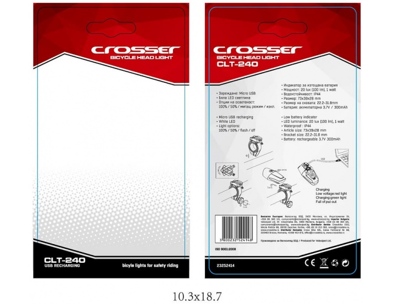Предна светлина Crosser CLT-240 се зарежда с micro USB, светлината е осигурена от LED диод от типа COD, който е енергоспестяващ. Crosser CLT240 има три режима на работа, а силата на светене на най-силният е 20lux (100лумена).